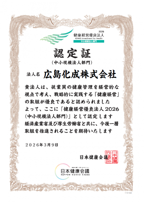 2026年3月11日 「健康経営優良法人2026(中小規模法人部門)」 に認定されました。 今後も社員の健康の維持・増進活動を積極的に 牽引し、健康的な職場作りを進めて参ります。